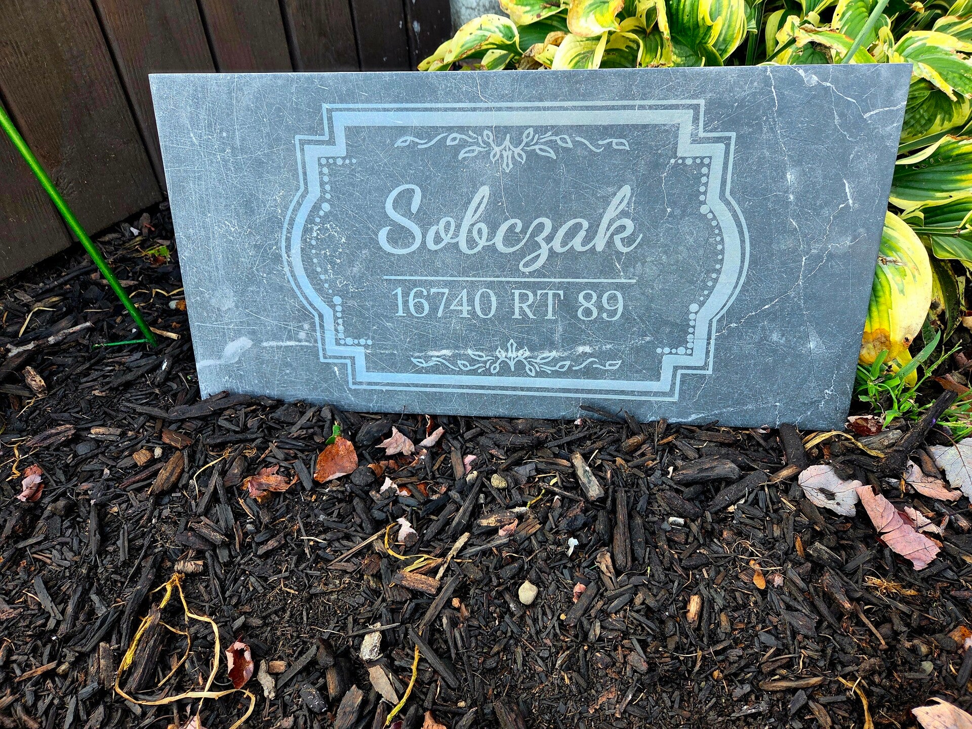 Make a beautiful first impression with our custom laser engraved faux gray marble address sign, designed to bring elegance and personalization to your home’s exterior or entryway. Each sign features your last name and address, beautifully framed by an ornate scroll design that adds timeless sophistication and curb appeal.